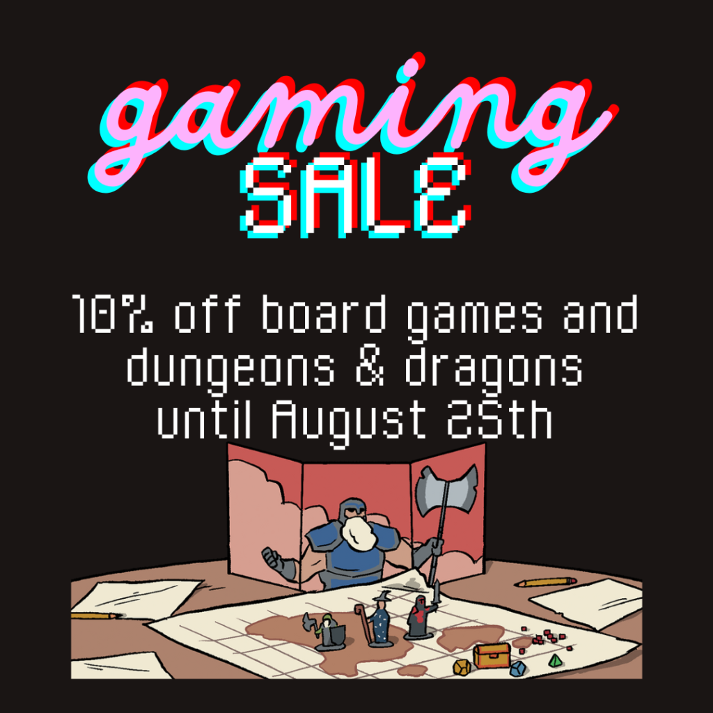 We’re putting all our in stock board games and Dungeons and Dragons books on sale for the next ten days! Take 10% off ALL board games and Wizards of the Coast published official D&D books in store until 8/25!